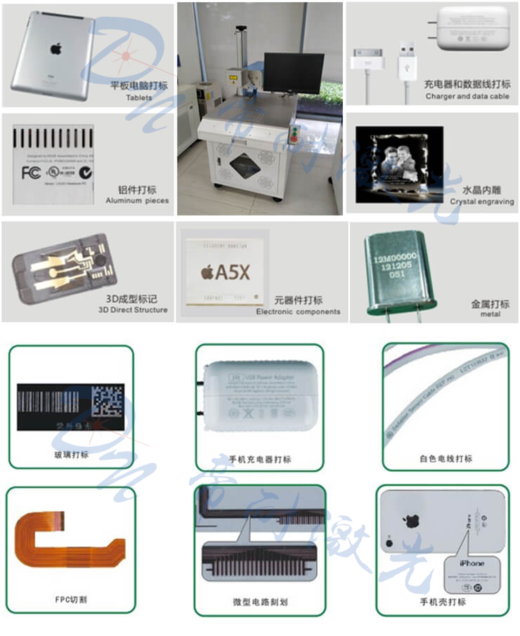 廣泛應(yīng)用于LCD液晶玻璃,LED基片,藍(lán)寶石基片,半導(dǎo)體晶圓,F(xiàn)PC柔性電路板,消費(fèi)類電子產(chǎn)品,手機(jī)部件,陶瓷等的二維碼以及數(shù)字字母精細(xì)打標(biāo),ITO刻膜等行業(yè)。